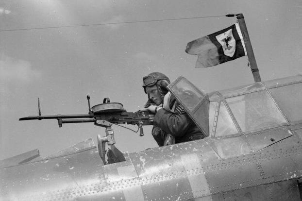 Air Gunner du 103 Squadron RAF avec sa mitrailleuse légère Vickers calibre 303 (IWM)